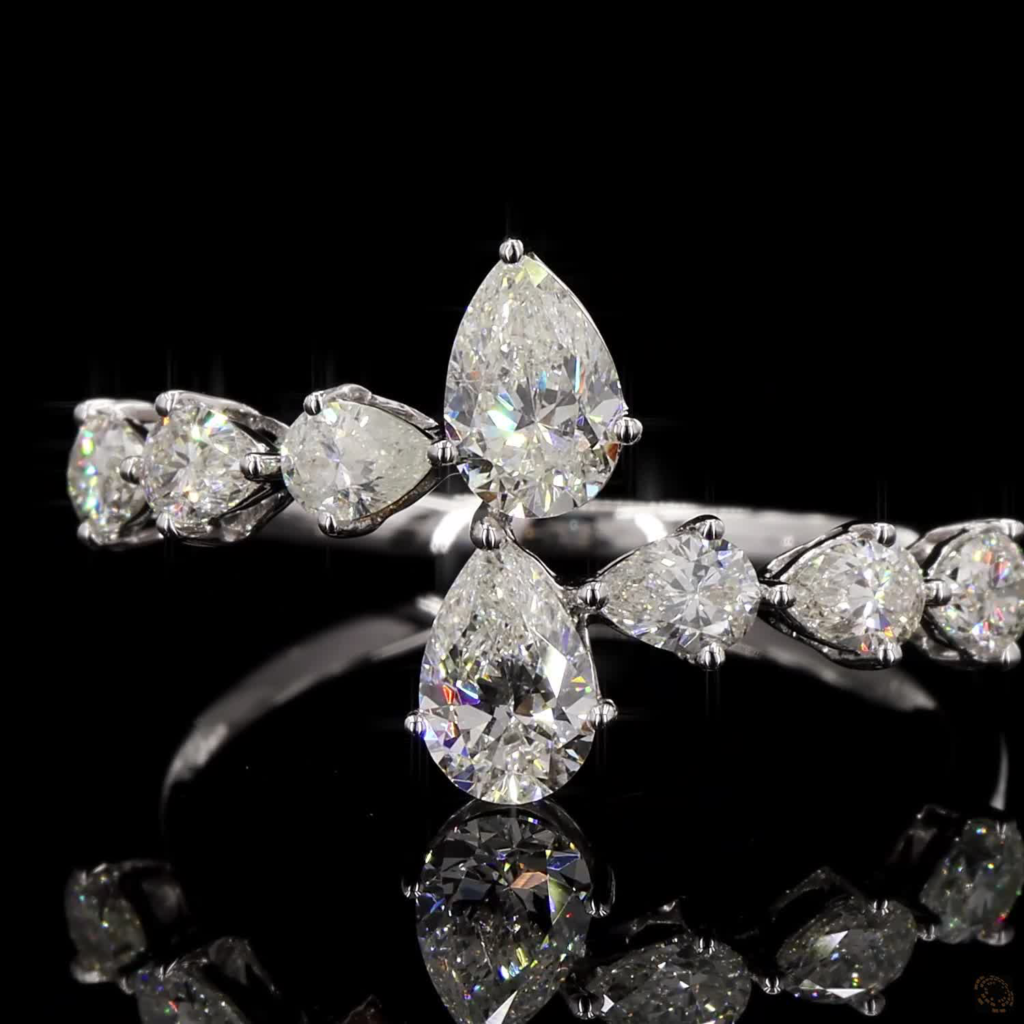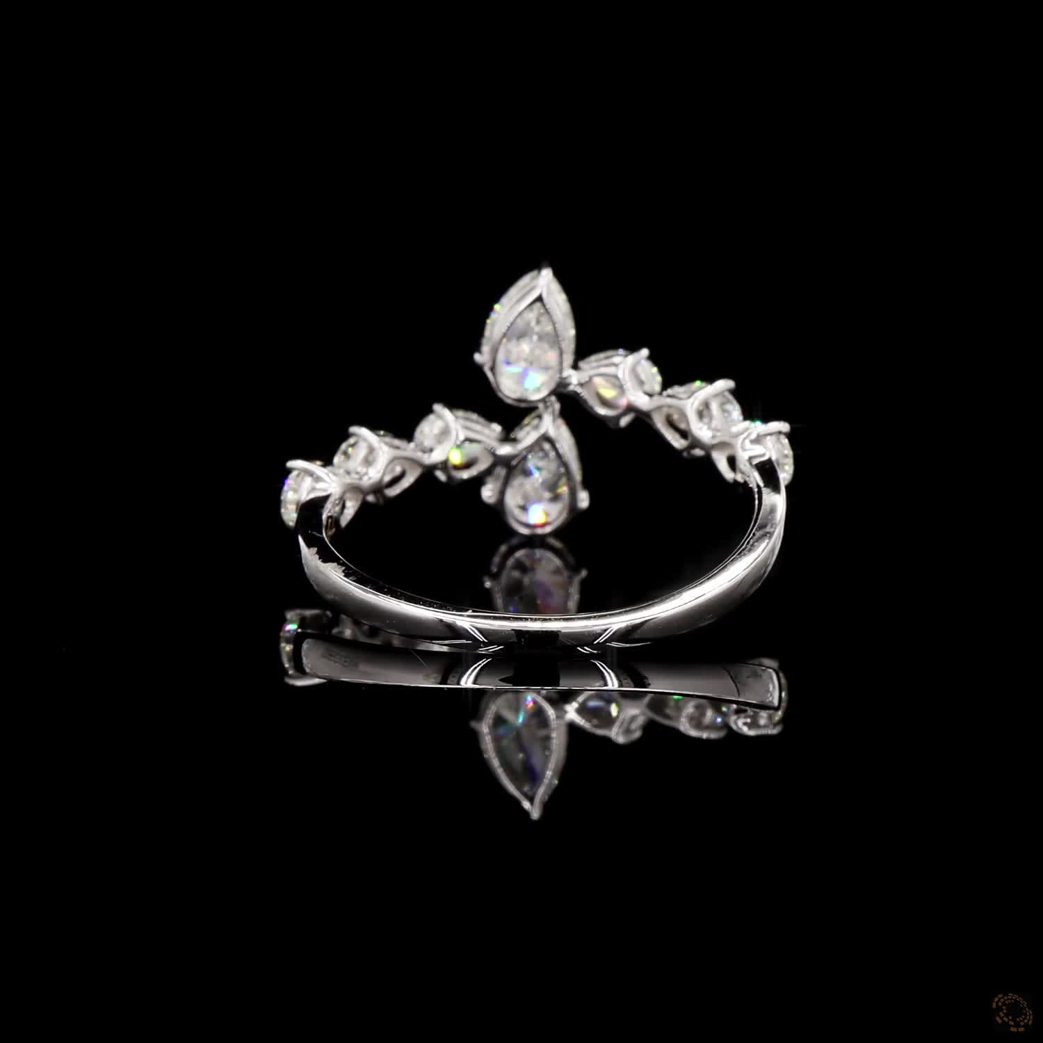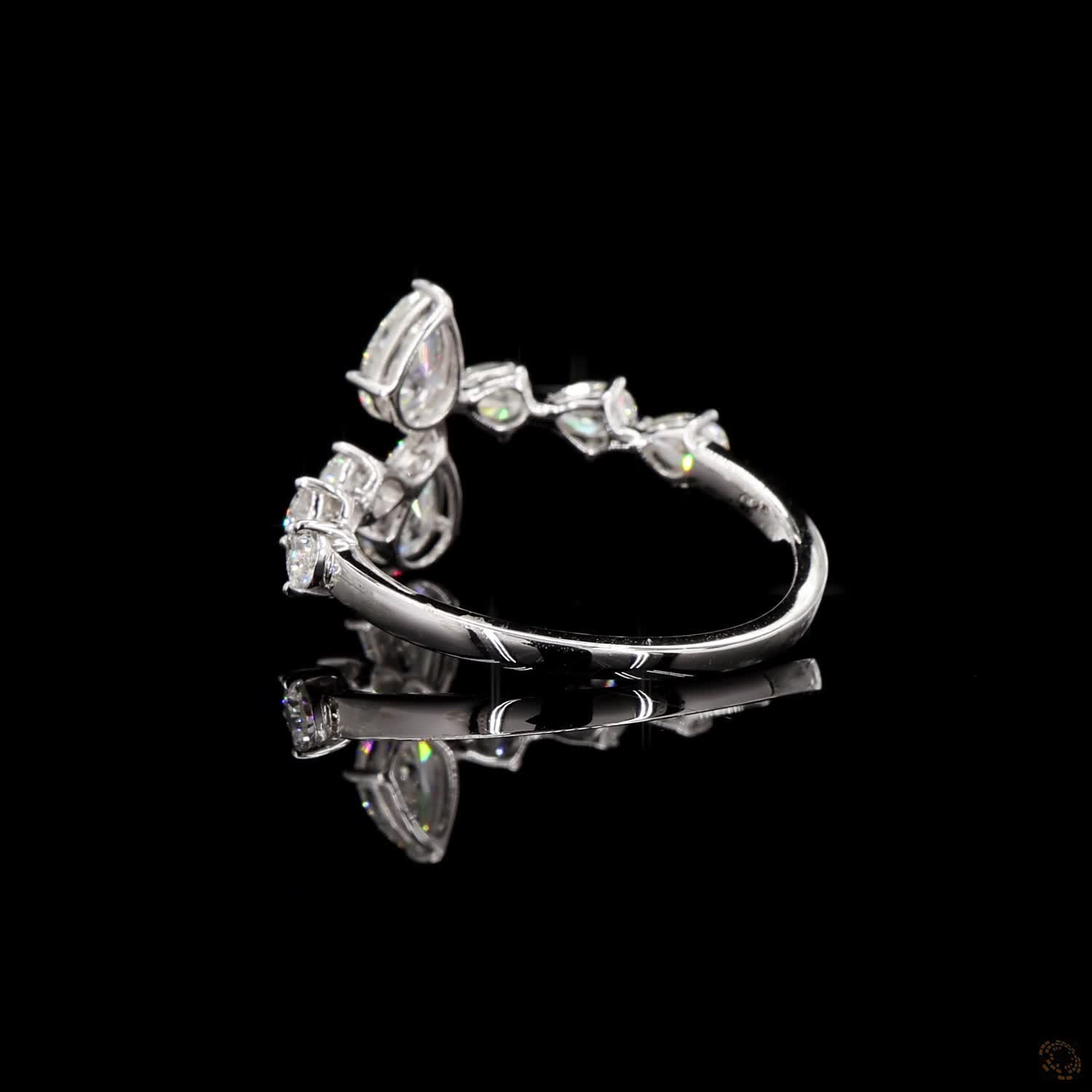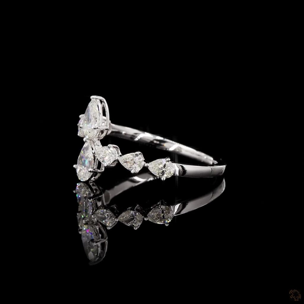 Nyra Twinleaf captures the essence of nature-inspired elegance. Its open-band design features two pear-cut diamonds facing each other like delicate leaves, accented by smaller stones for added brilliance. The airy structure enhances comfort while offering a contemporary aesthetic, making it perfect for effortless day-to-night wear.