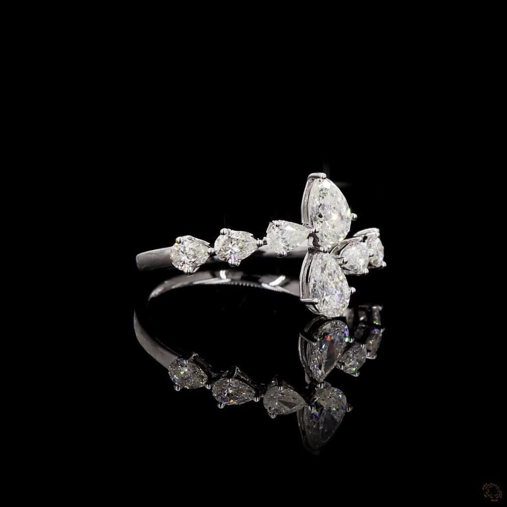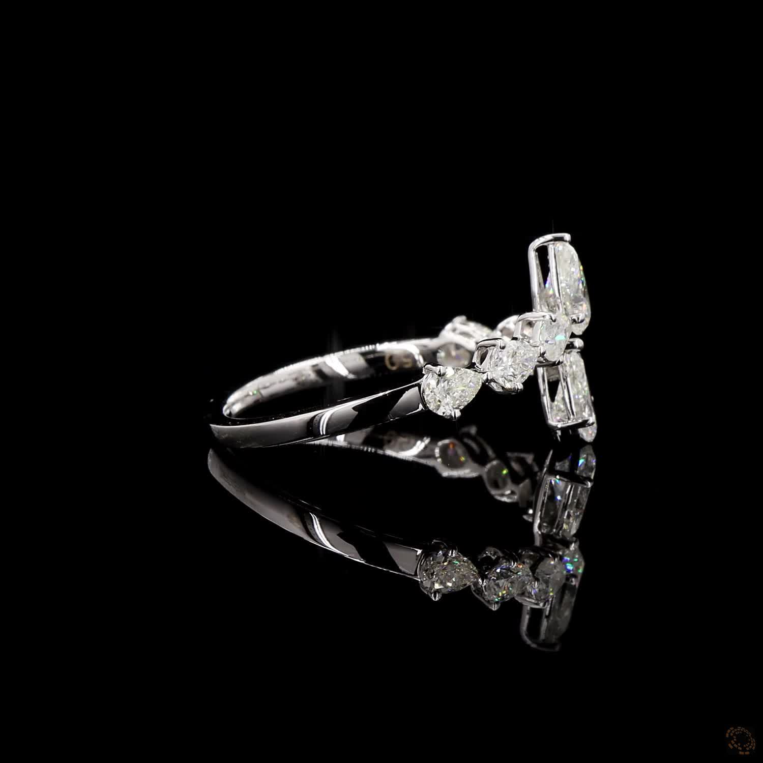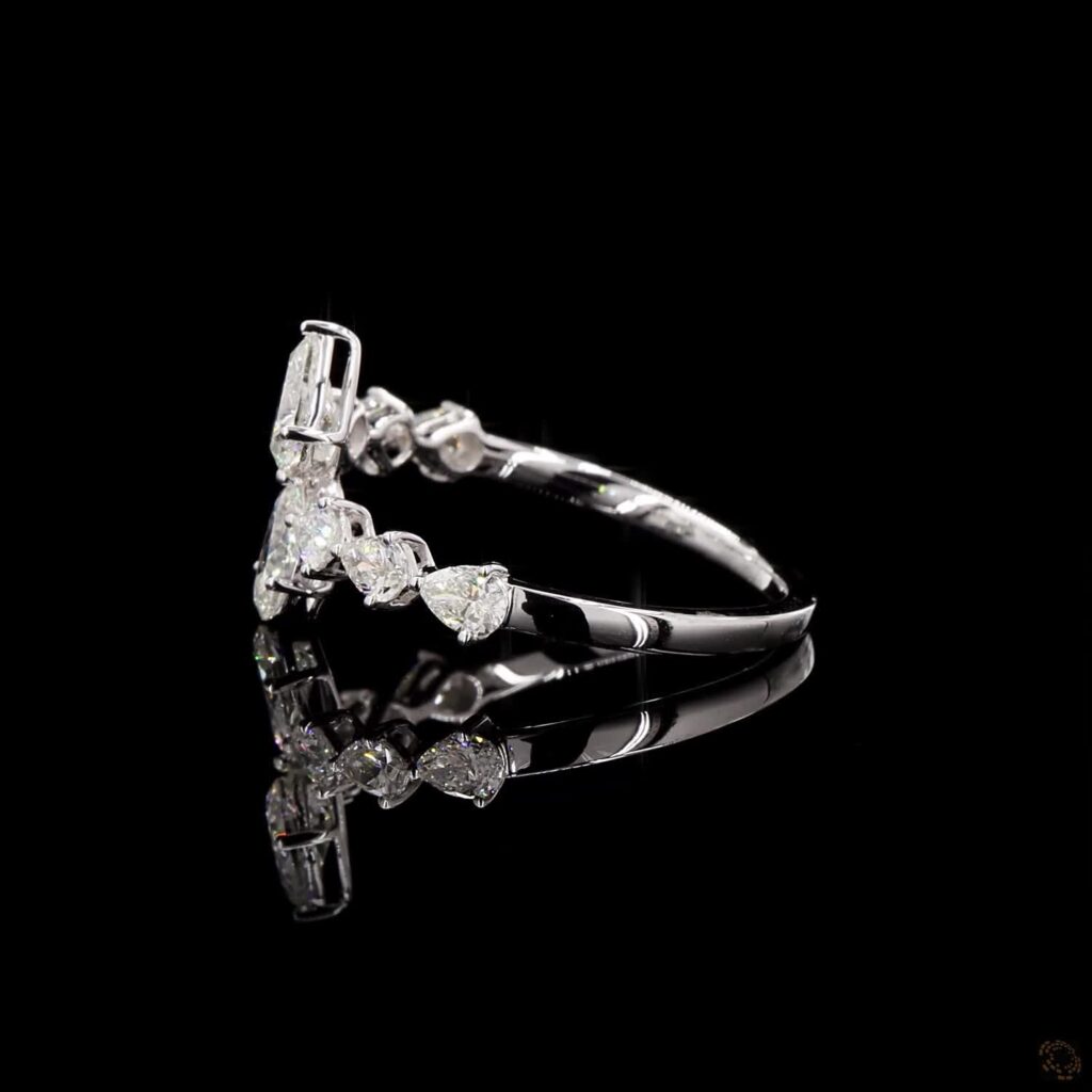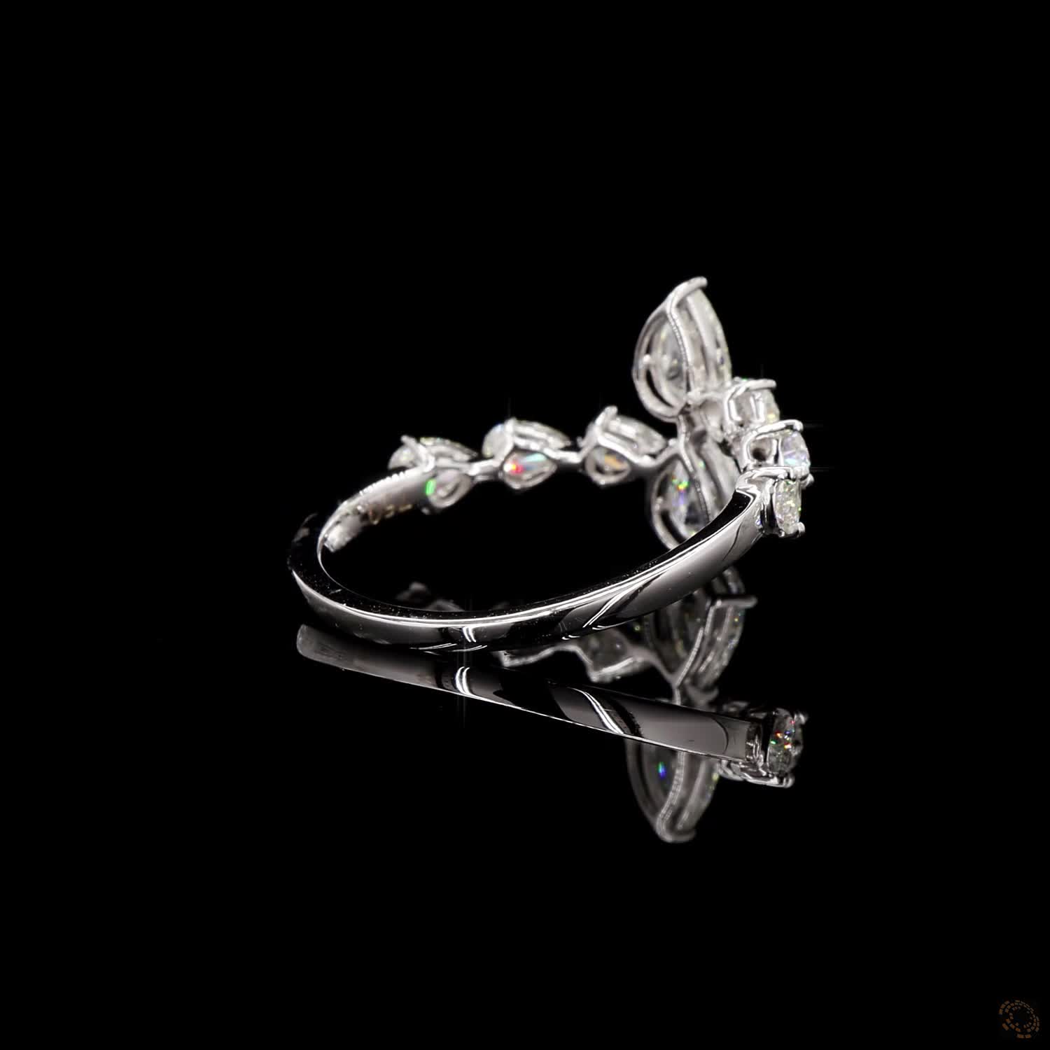 Nyra Twinleaf captures the essence of nature-inspired elegance. Its open-band design features two pear-cut diamonds facing each other like delicate leaves, accented by smaller stones for added brilliance. The airy structure enhances comfort while offering a contemporary aesthetic, making it perfect for effortless day-to-night wear.