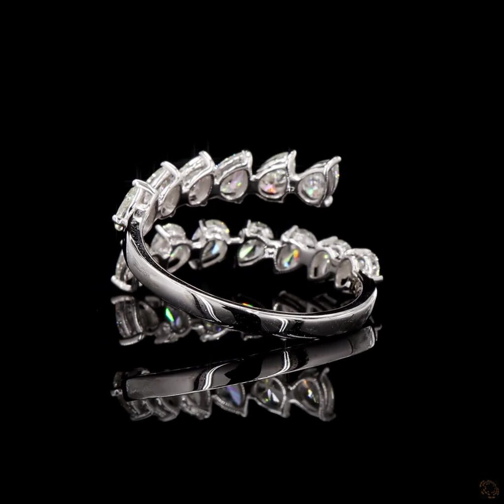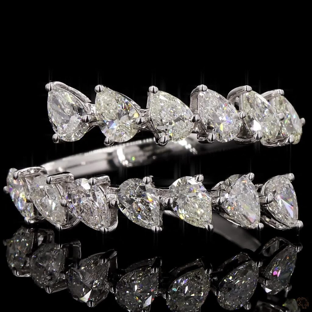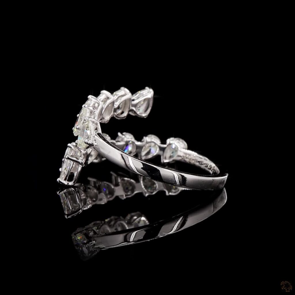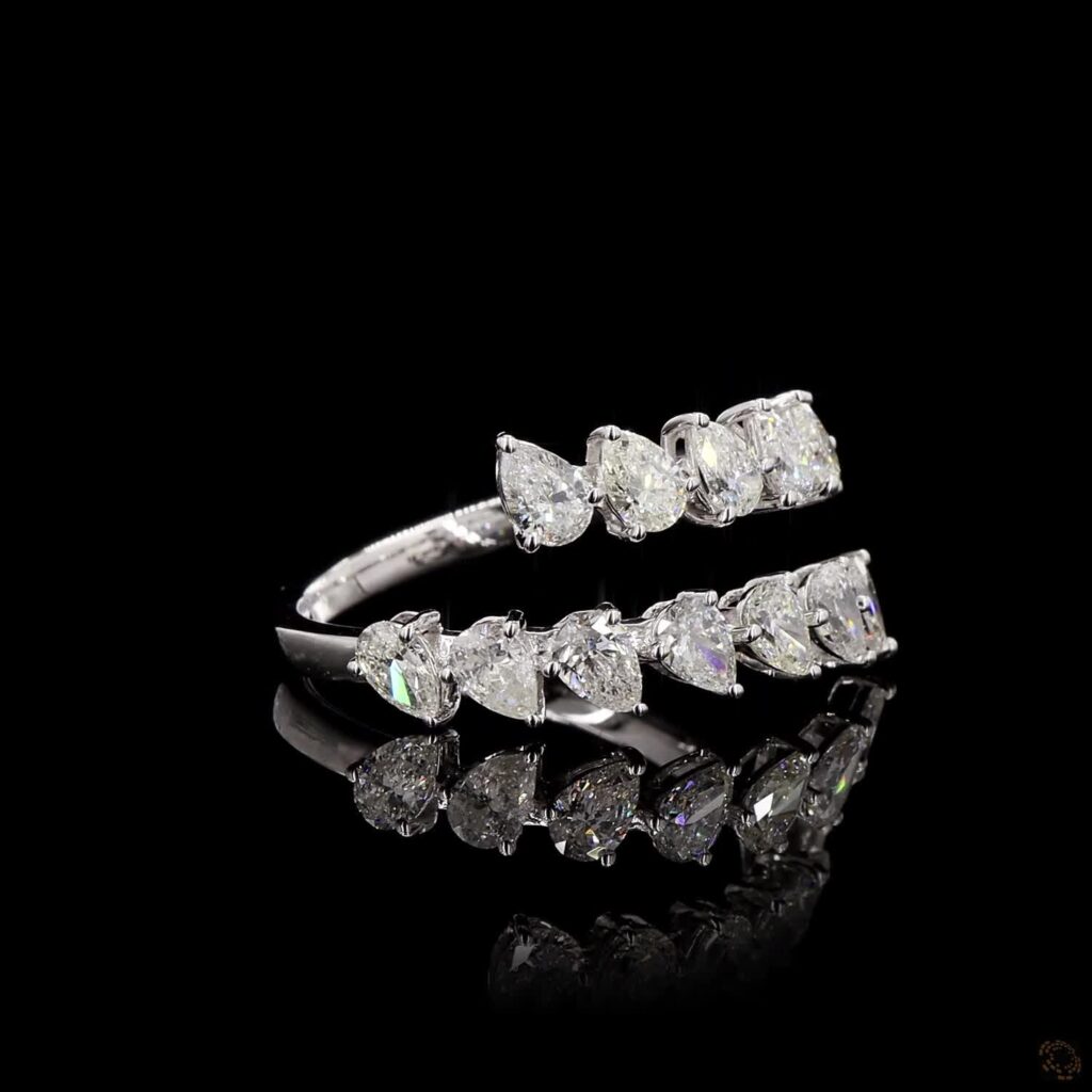 The Celestara Pearline Arc Ring is a refined expression of fluid brilliance and modern elegance. Featuring a seamless row of pear-shaped diamonds, each stone is meticulously set to create a soft, flowing silhouette that gently curves around the finger. The pointed tips align in harmony, forming a delicate rhythm of light and sparkle.