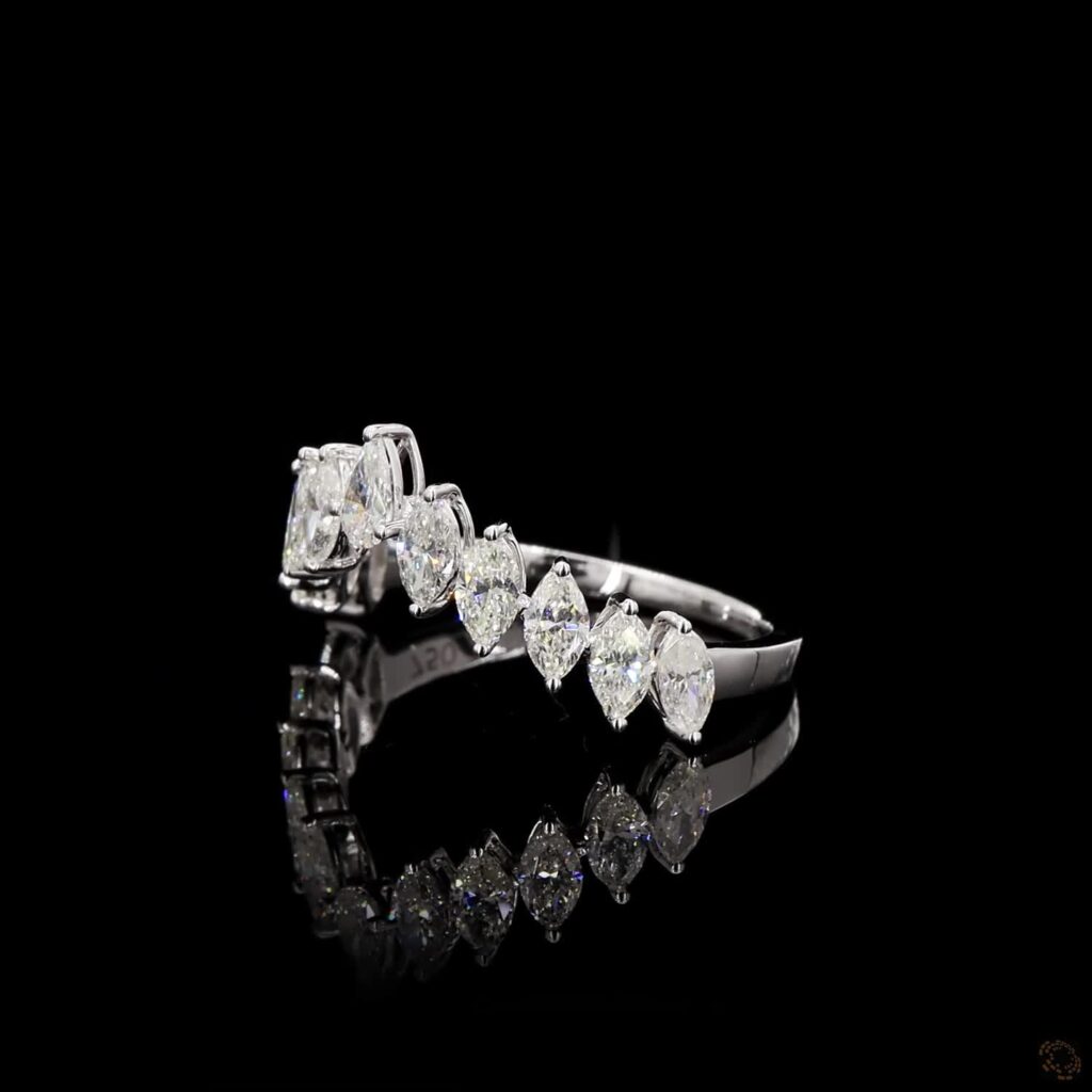 The Ring captures the essence of modern royalty with its elegant tiara-like silhouette. A seamless row of meticulously set marquise-cut diamonds forms a soft, undulating crest—each stone angled to maximize light, fire, and fluidity. The design curves gently along the finger, creating a crown effect that feels both delicate and commanding.