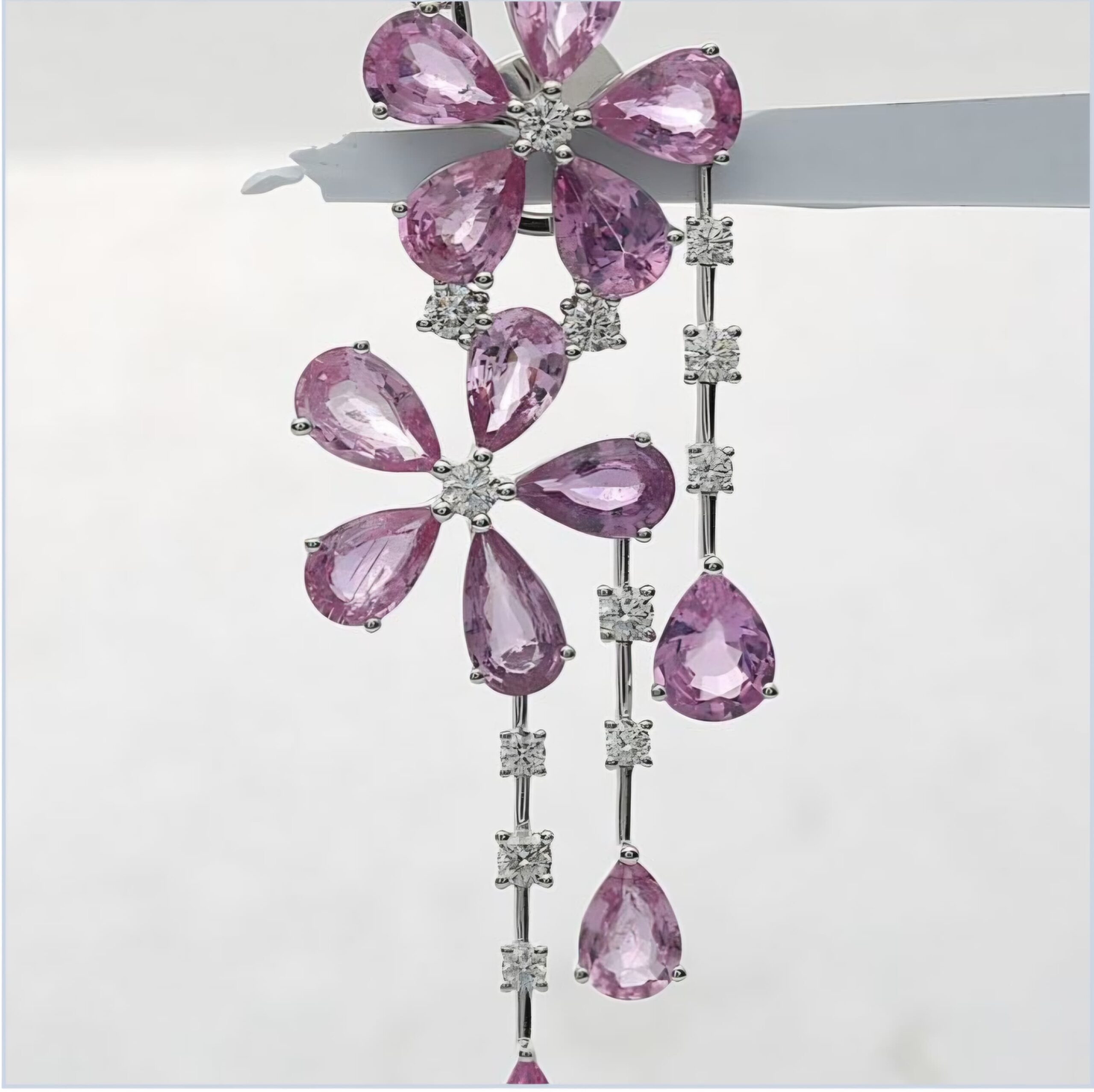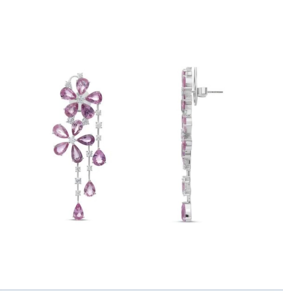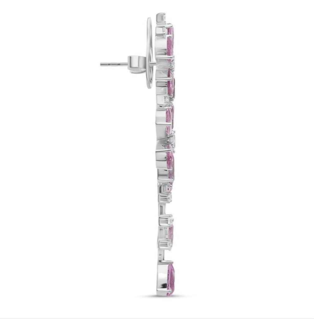 From these blossoms descends a fluid cascade of brilliant diamonds, interspersed with delicately set pink drops that sway with effortless grace. Crafted in luminous white metal, the design balances structure and movement—creating a silhouette that is both ethereal and striking.