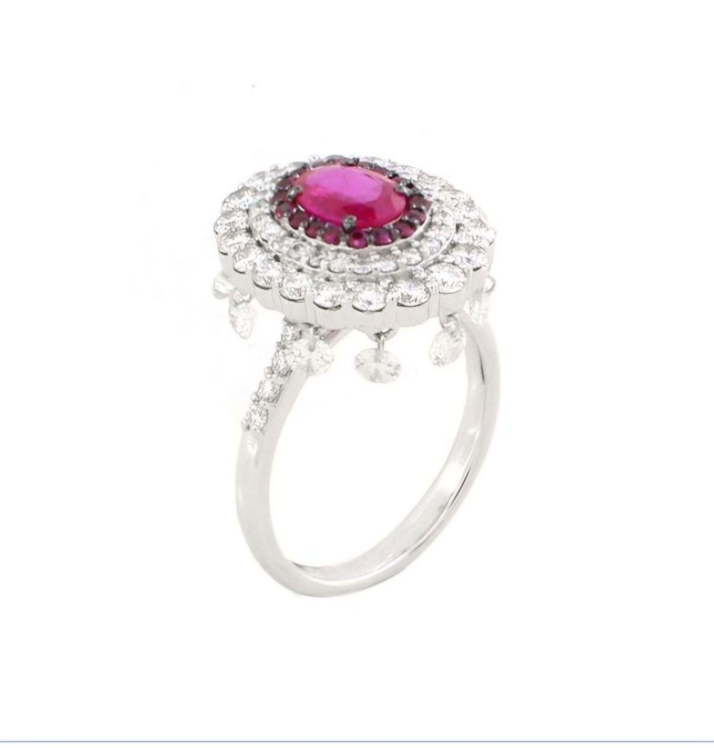 A radiant oval ruby embraced by a halo of diamonds, blooming like a celestial flower in timeless brilliance.