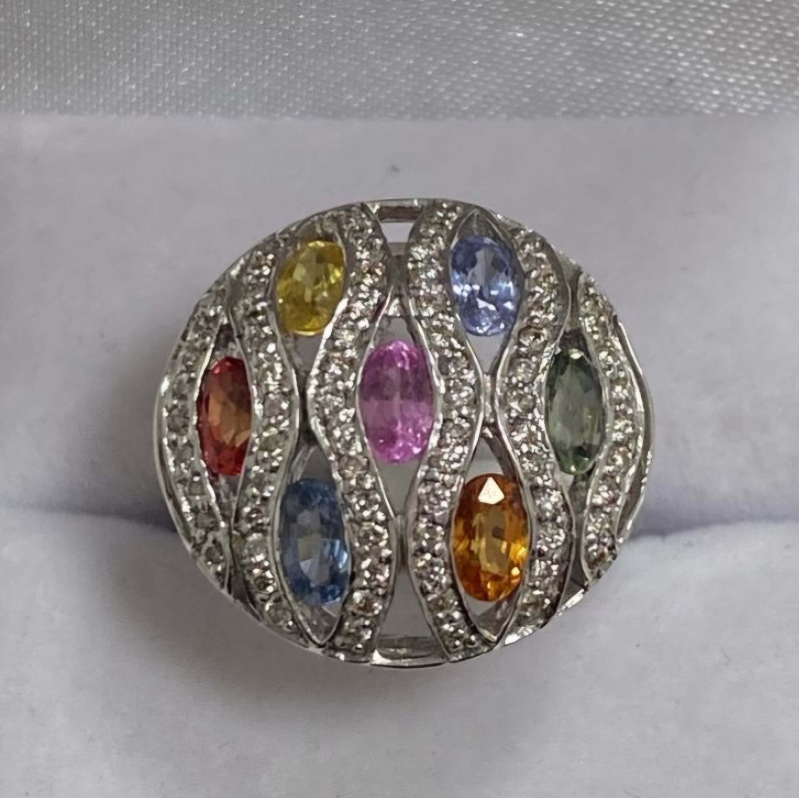 Framed by intricately set shimmering accents, the design flows in graceful waves, adding depth, movement, and a captivating brilliance from every angle. At its center, a vivid pink gemstone draws the eye, while surrounding tones of sapphire blue, golden yellow, emerald green, and warm amber create a rich, prismatic composition that feels both vibrant and sophisticated.