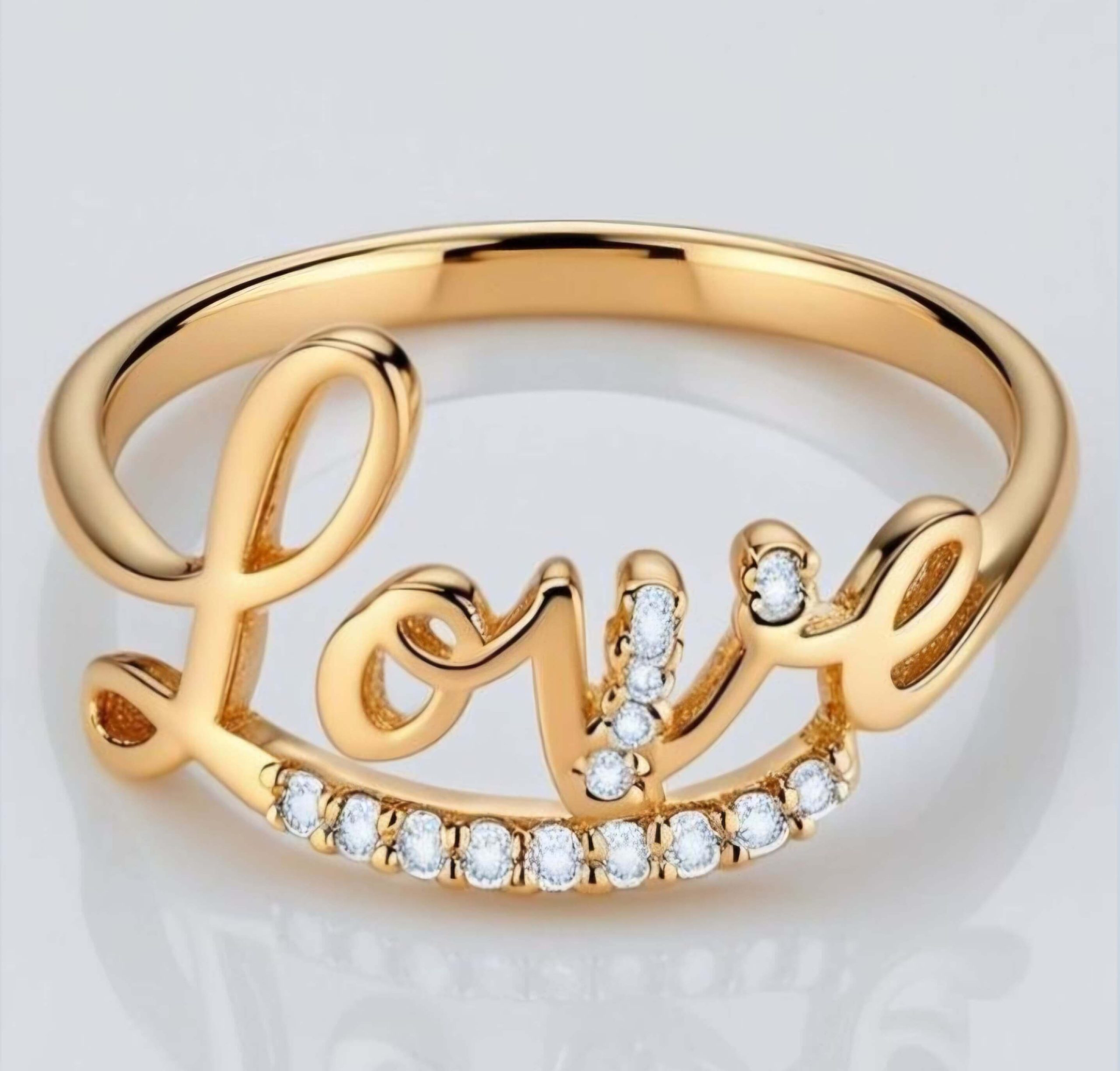 A delicate gold ring sculpted into the word Love, adorned with shimmering diamonds—an elegant symbol of affection and timeless romance.