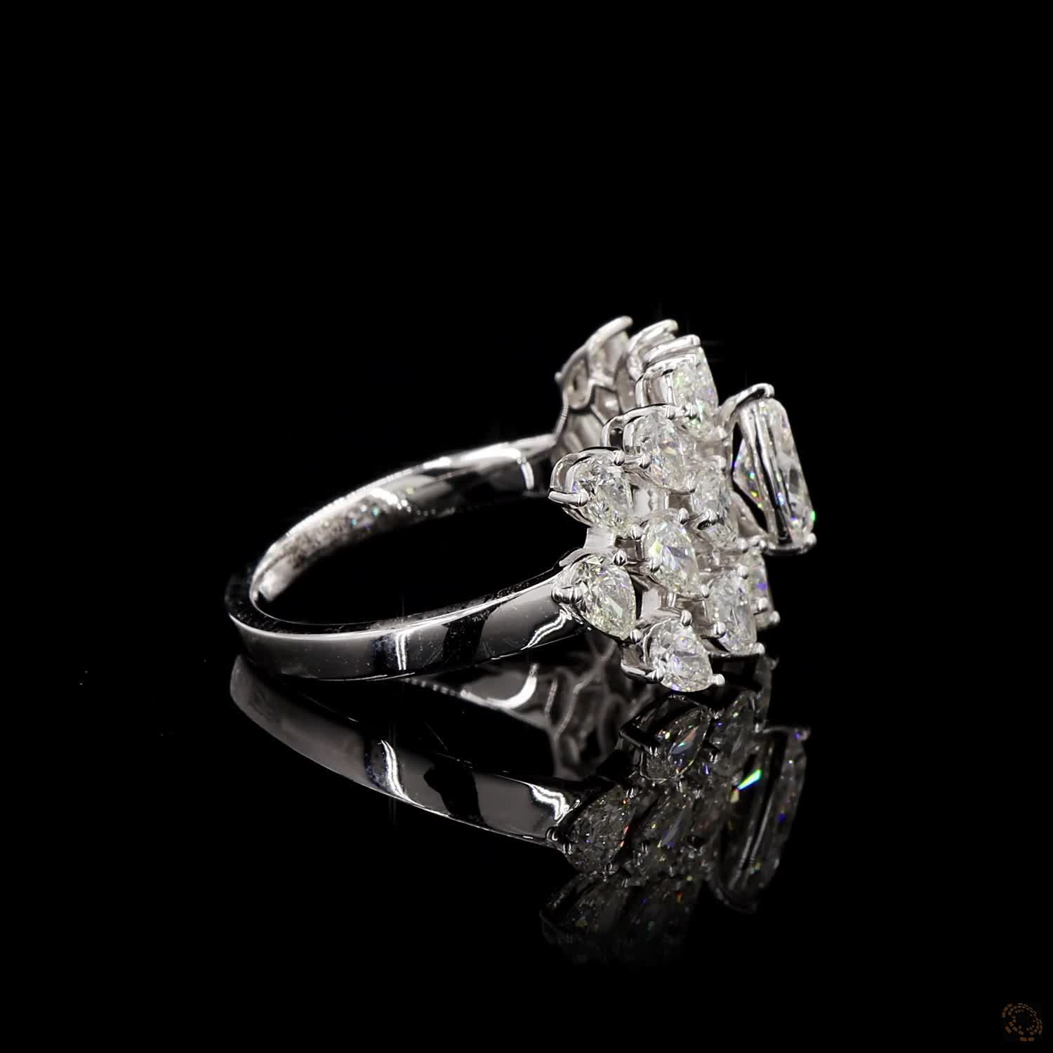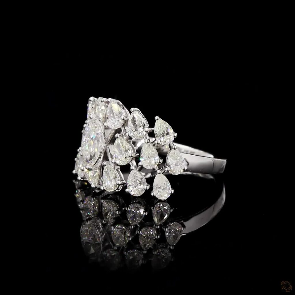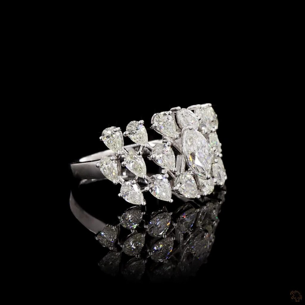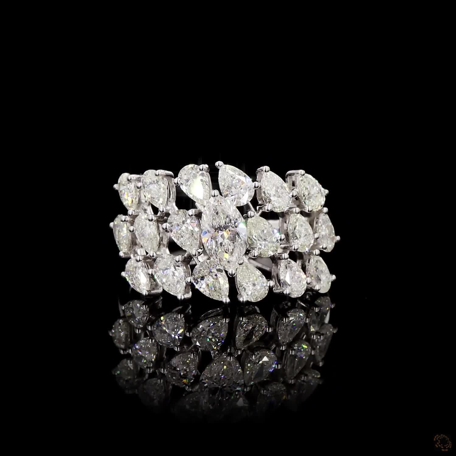 The Veliora Bloom Band is a celebration of brilliance and form, crafted with layers of meticulously set pear-cut diamonds that come together in a captivating floral composition. Each diamond is positioned to reflect light from every angle, creating a continuous shimmer that feels both luxurious and alive. The wide band design gives it a bold, statement presence, while the delicate petal-like arrangement softens it with elegance and grace. Perfect for those who desire a piece that blends grandeur with artistry, this ring is a true expression of modern high jewellery—where every detail blooms with light.