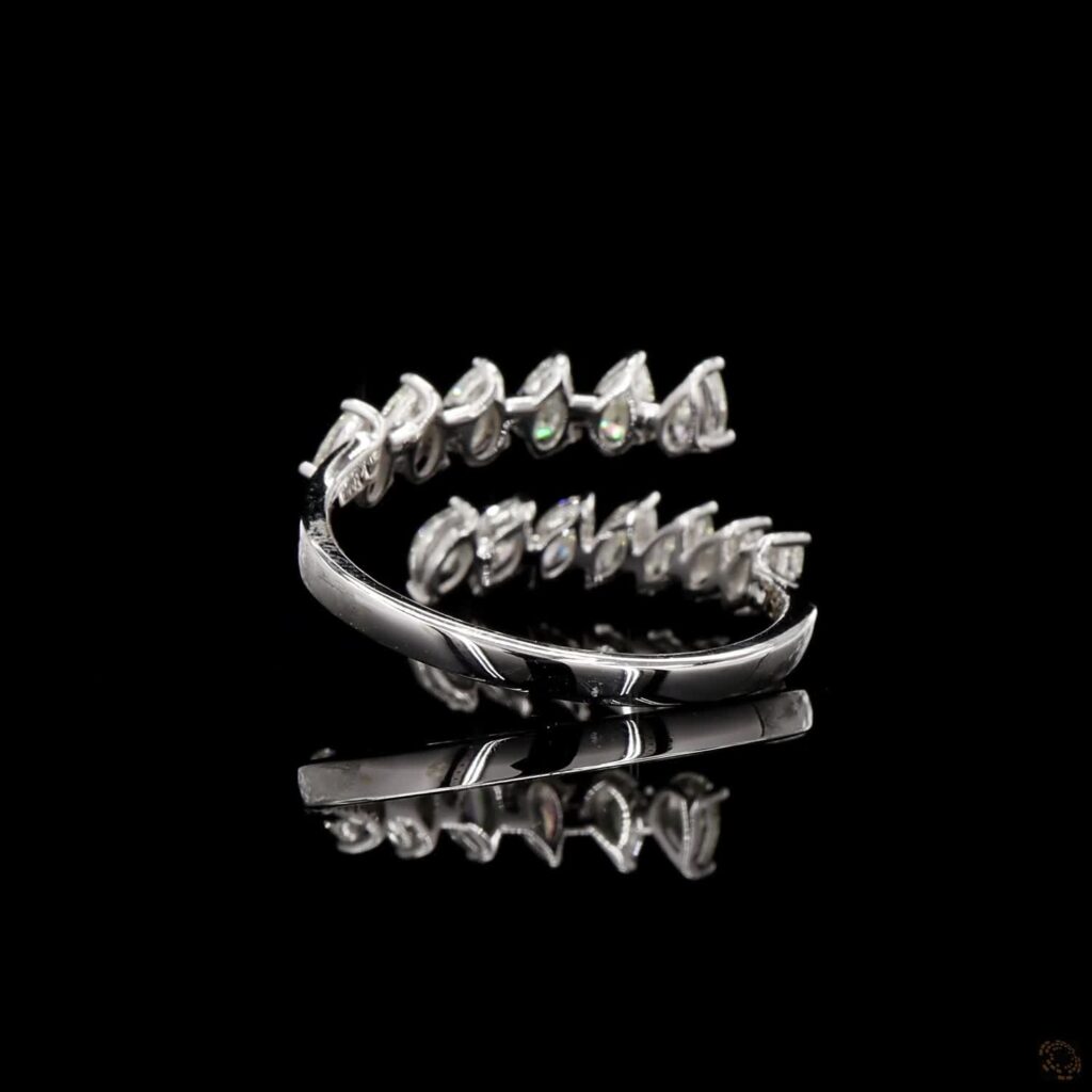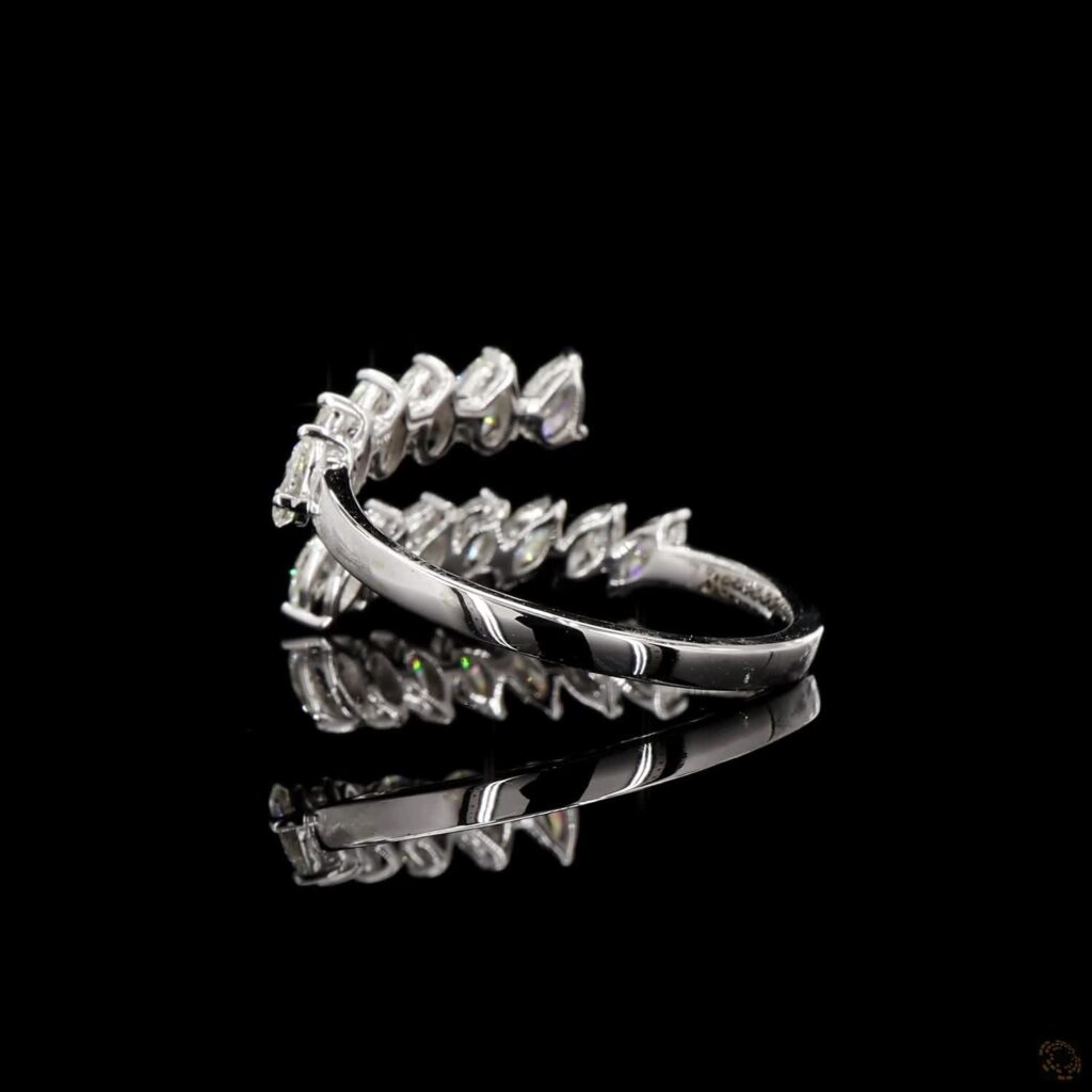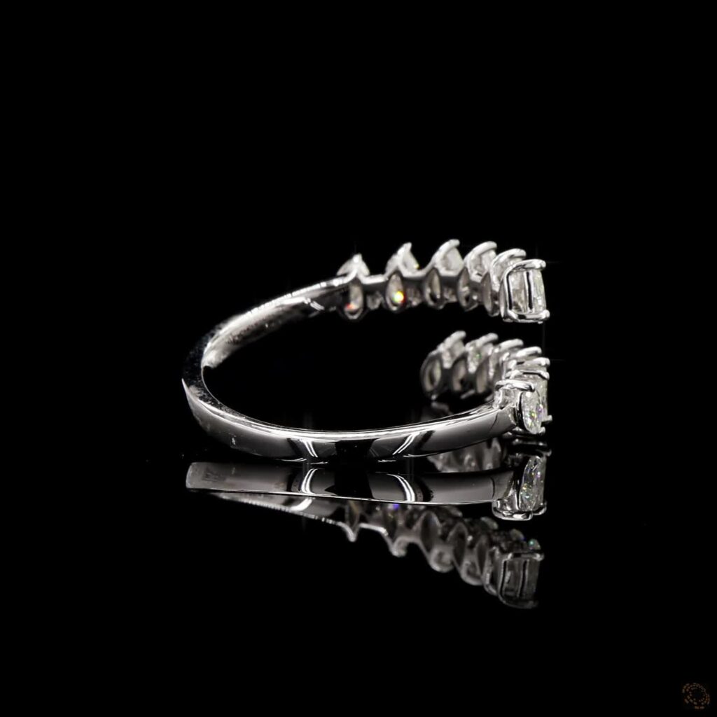 A graceful dual-band ring adorned with pear-cut diamonds, creating a mirrored crown of brilliance.